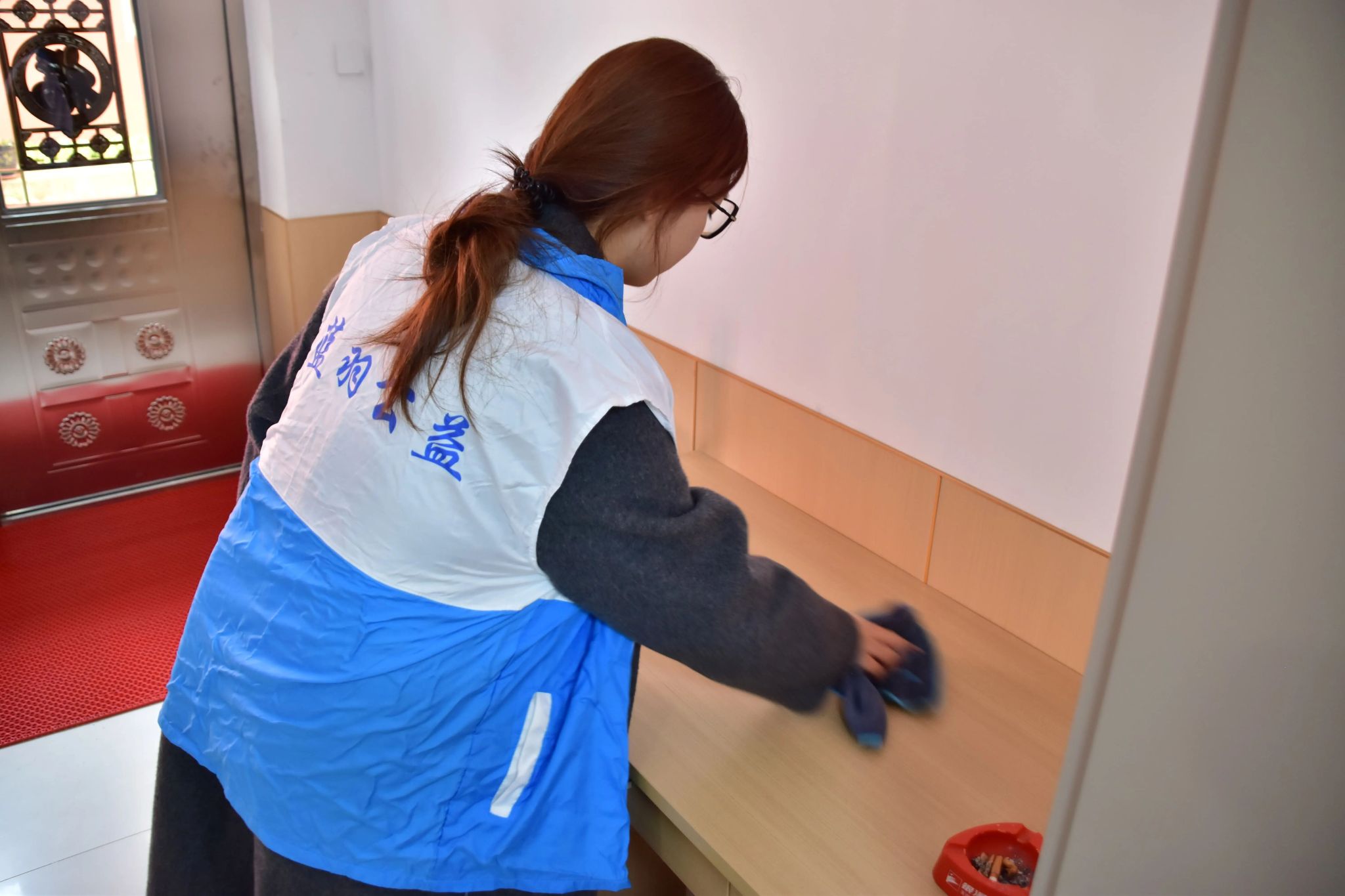 在聊天的同时,另一部分志愿者开始帮忙打扫养老院的公共区域和老人房间。有人拿起扫帚清扫落叶,有人擦起窗户让阳光透进来,有人整理书架和桌面,让物品摆放得整整齐齐。