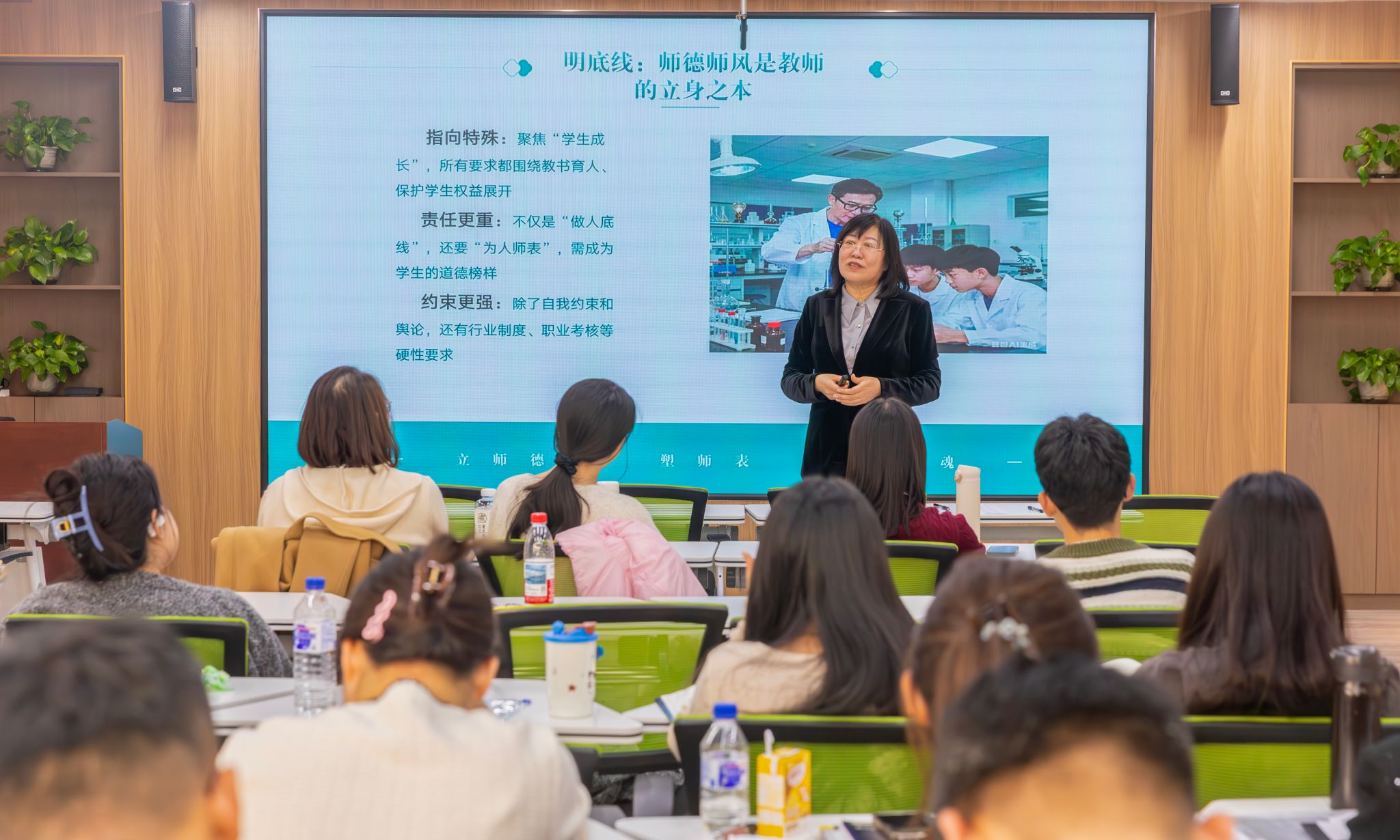 汪沅教授指出,师德是国家重视、学校严评、个人自律的“硬标准”:国家层面多部门发文强调师德师风建设,学校将其作为教师评价的第一标准并实行“一票否决”,个人行为纳入聘用合同管理,坚持“零容忍”。她进一步明确了师德底线——政治立场坚定、教学科研规范、师生关系廉洁、社会行为自律;而教育家精神则是党对教师要求的升华,需通过“落小落细落实”,将理想信念、仁爱之心等融入备课、作业、实践等教学环节,以课程思政实现育人价值。