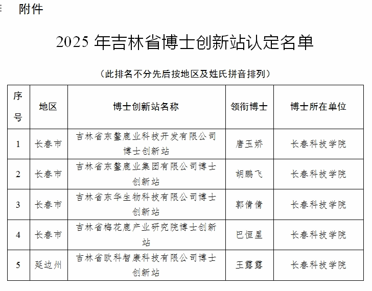 此次获批的5家博士创新站分别为:唐玉娇博士领衔的吉林省东鳌鹿业科技开发有限公司博士创新站、胡鹏飞博士领衔的吉林省东鳌鹿业集团有限公司博士创新站、郭倩倩博士领衔的吉林省东华生物科技有限公司博士创新站、巴恒星博士领衔的吉林省梅花鹿产业研究院博士创新站,以及王露露博士领衔的吉林省欧科智康科技有限公司博士创新站。