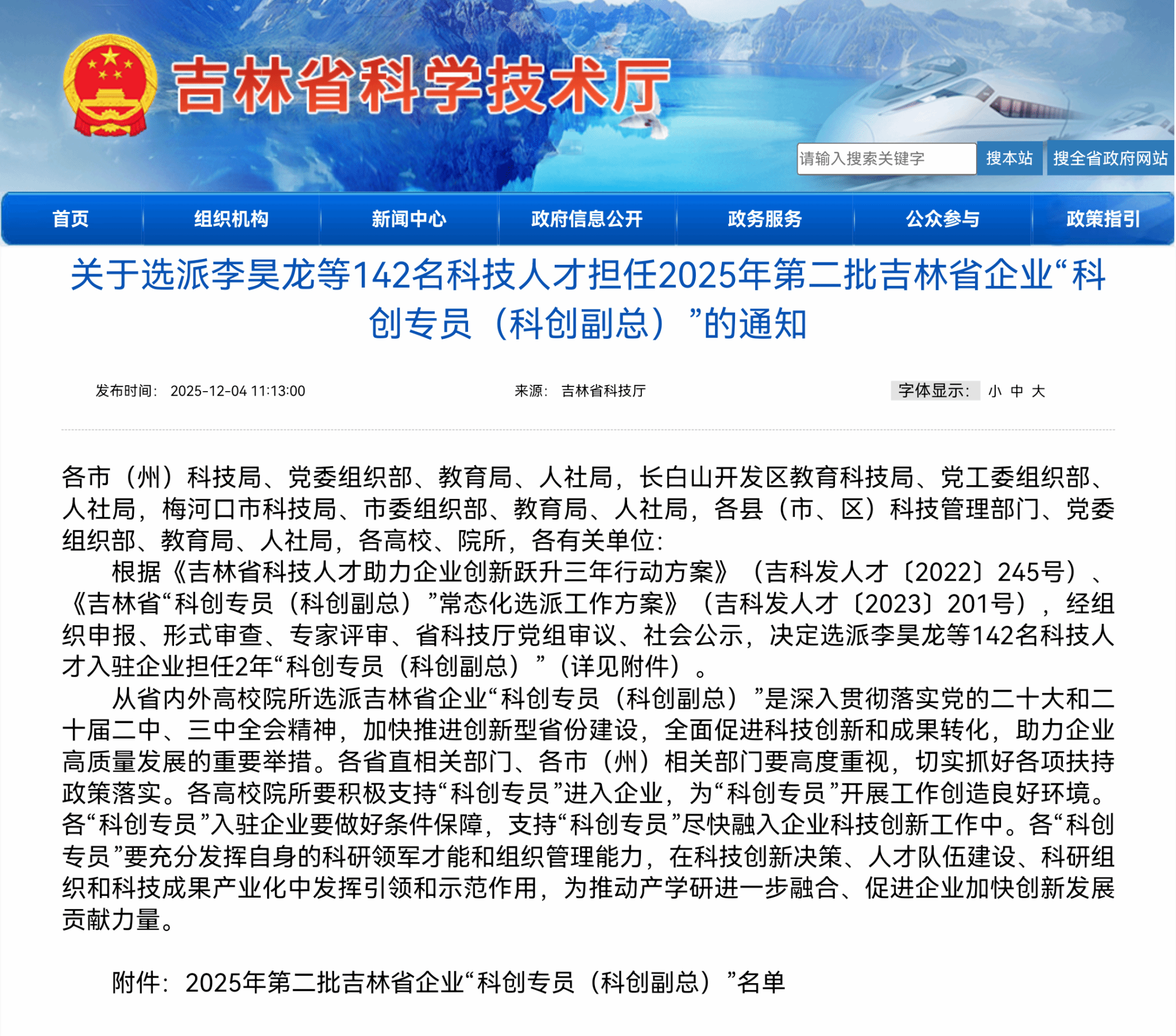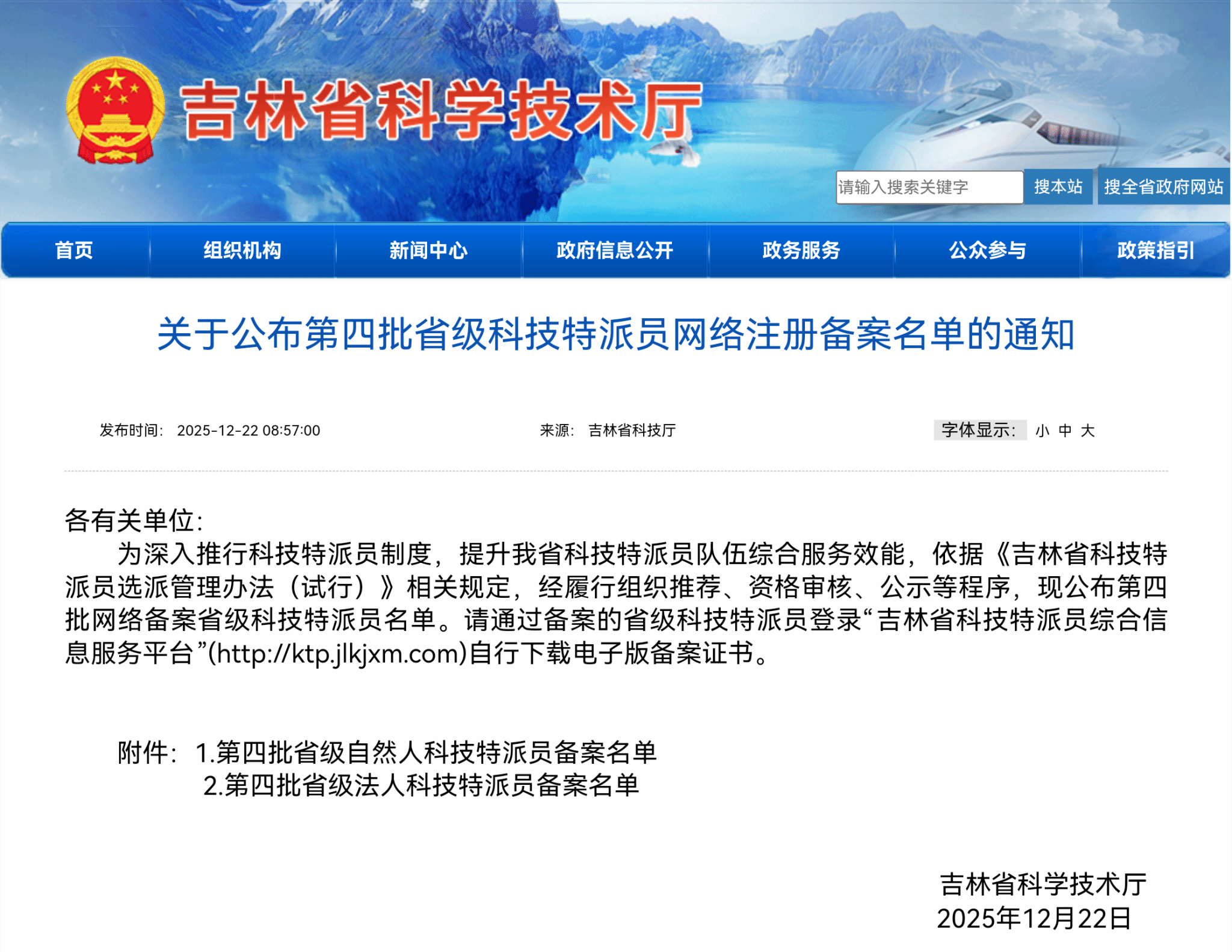 依据《吉林省科技人才助力企业创新跃升三年行动方案》和《吉林省“科创专员(科创副总)”常态化选派工作方案》,经申报审核、专家评审、省科技厅党组审议和公示,我校贾冬舒、孙永杰2位科技人才被正式选派入企。