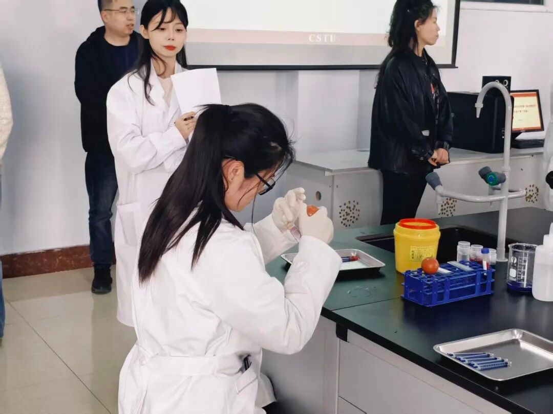 生命科学学院院长李国江、副院长唐玉娇、教务处黄琼老师、赛创中心主任刘畅、动物医学专业主任姜晶、副主任姚贵哲、张奥老师莅临现场观摩指导。观摩过程中,各位老师全程专注观察学生的操作细节。李国江院长在看到部分学生操作精准、思路清晰、展现出较强的动手能力与科研潜质时,现场给予高度肯定,称赞其具备良好的科研素养与发展潜力