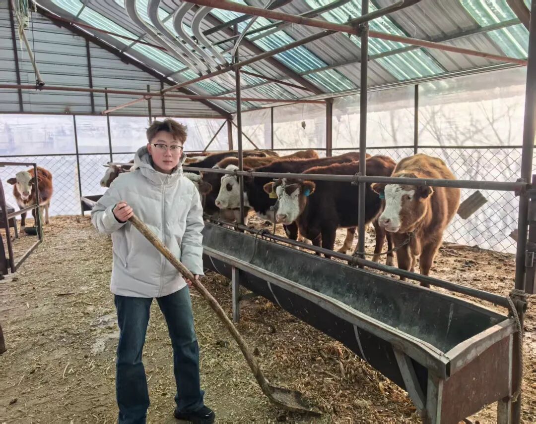 大家好,我是来自25级动医七班的胡鑫源。寒假期间,我回到了吉林省敦化市官地镇岗子村,开展志愿实践活动。实践期间,我跟随工作人员学习肉牛日粮配制的技巧,将粉碎的玉米秸秆、软糯的青贮饲料与营养精料精准配比;而后,我主动承担起圈舍卫生维护的职责,手握铁锹,仔细清理圈舍内的粪便与垫料混合物;除此之外,我专注学习肉牛健康评估的方法,同时协助工作人员调整日粮结构、添加益生菌;闲暇时,我认真聆听工作人员分享判断牛消化状态的实用技巧,也了解到基地正稳步探索数字化养殖新模式,让传统养殖更具科学性与高效性。这段扎根养殖基地的实践时光,于我而言,是一次专业认知的淬炼,更是一场青春初心的践行,让我坚定了我扎实学好专业知识、锤炼实操能力的决心,愿从点滴积累做起,用所学守护畜禽健康,为家乡养殖出一份力。