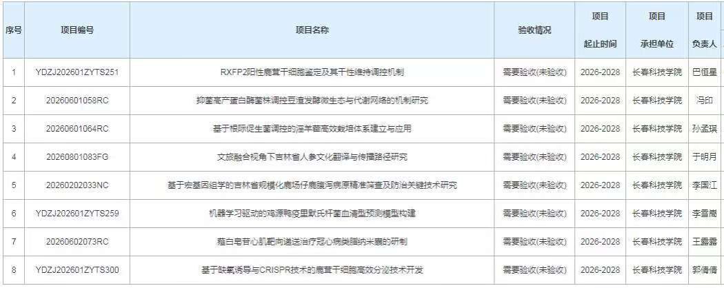 学院科研项目申报工作成效显著,李国江教授、冯印教授申报的项目分别获批吉林省科技发展计划项目,获批经费分别为50万元、35万元;刘艳教授与冯印教授联合参与申报的省科技厅重点研发项目“高蛋白秸秆发酵饲料生产关键技术研发及产品开发”,成功斩获18万元立项经费,充足的经费支持为科研攻坚提供了有力保障。此外,多项科研项目顺利推进或获批,包括姚贵哲2026年度吉林省教育厅科学研究项目获批、姜晶参与的吉林省肉牛产业化发展重大科技专项(已完成验收)、王静怡与张铭泽学校“人工智能+”科研基金项目、刘莹2025年度吉林省教育科学“十四五”规划课题。