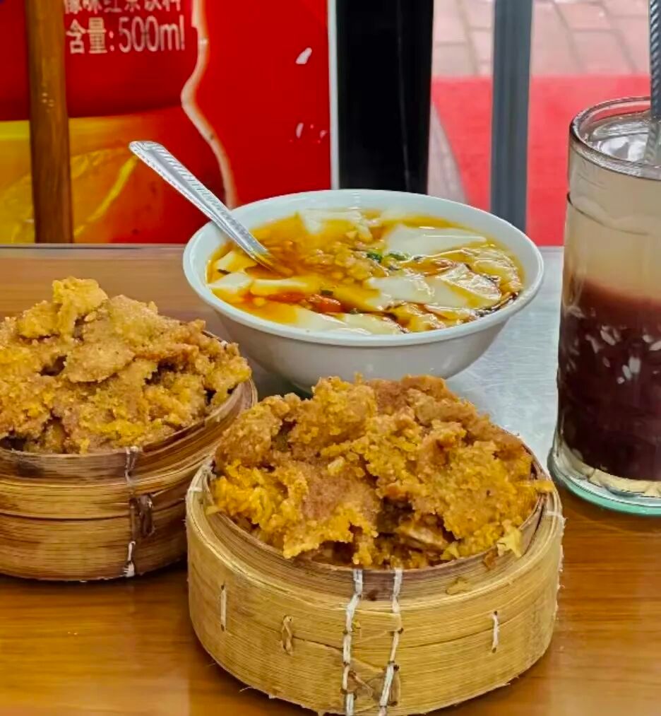 清晨的蒸笼旁,竹屉掀开便是渣肉蒸饭——糯米肉香软糯,渣肉裹着米粉酥嫩,配一碗滑嫩的豆腐脑,是芜湖人晨起的温柔滋味。