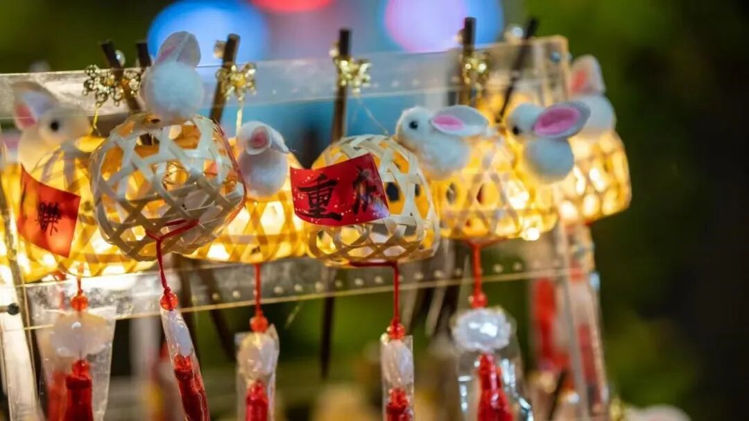 夜市兔灯暖光轻晃,竹编纹裹着 “福” 字,香囊随晚风轻摇,把传统年味揉进城市夜巷的热闹里。