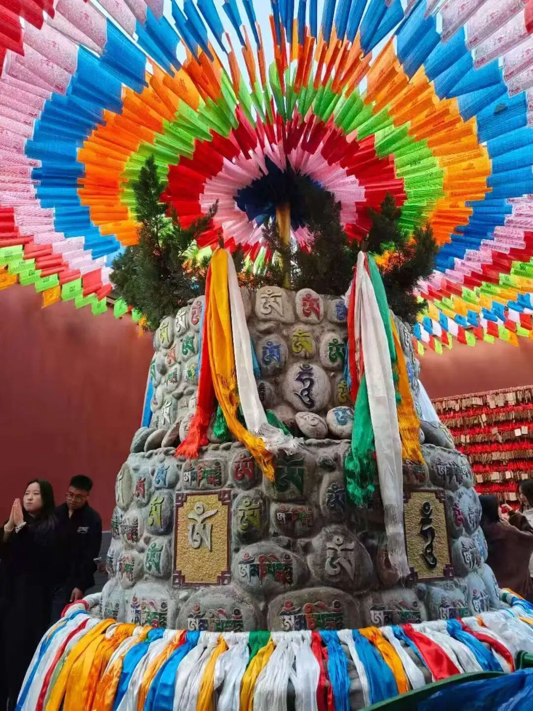 西安广仁寺,人们围绕刻有六字真言的玛尼堆顺时针绕行,将哈达系在堆上祈福,色彩鲜艳的经幡与玛尼堆相映。