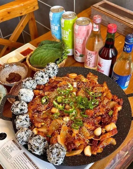 朝鲜族美食延边火辣鸡爪锅,软糯脱骨的鸡爪裹满甜辣酱汁,搭配海苔饭团蘸汤吃是特色。