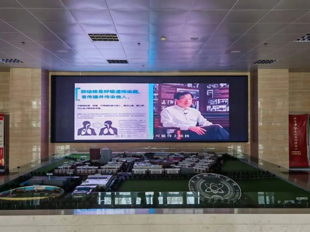 校园大屏联动宣传,让科普知识抬头可见。学校在大厅电子大屏持续滚动播放结核病防治科普视频,直观讲解结核病呼吸道传播特性、典型症状、规范治疗流程及日常防护要点,师生出入校园时即可轻松学习健康知识,实现了驻足可学、入耳入心的宣传效果,让防控知识潜移默化地深入人心。