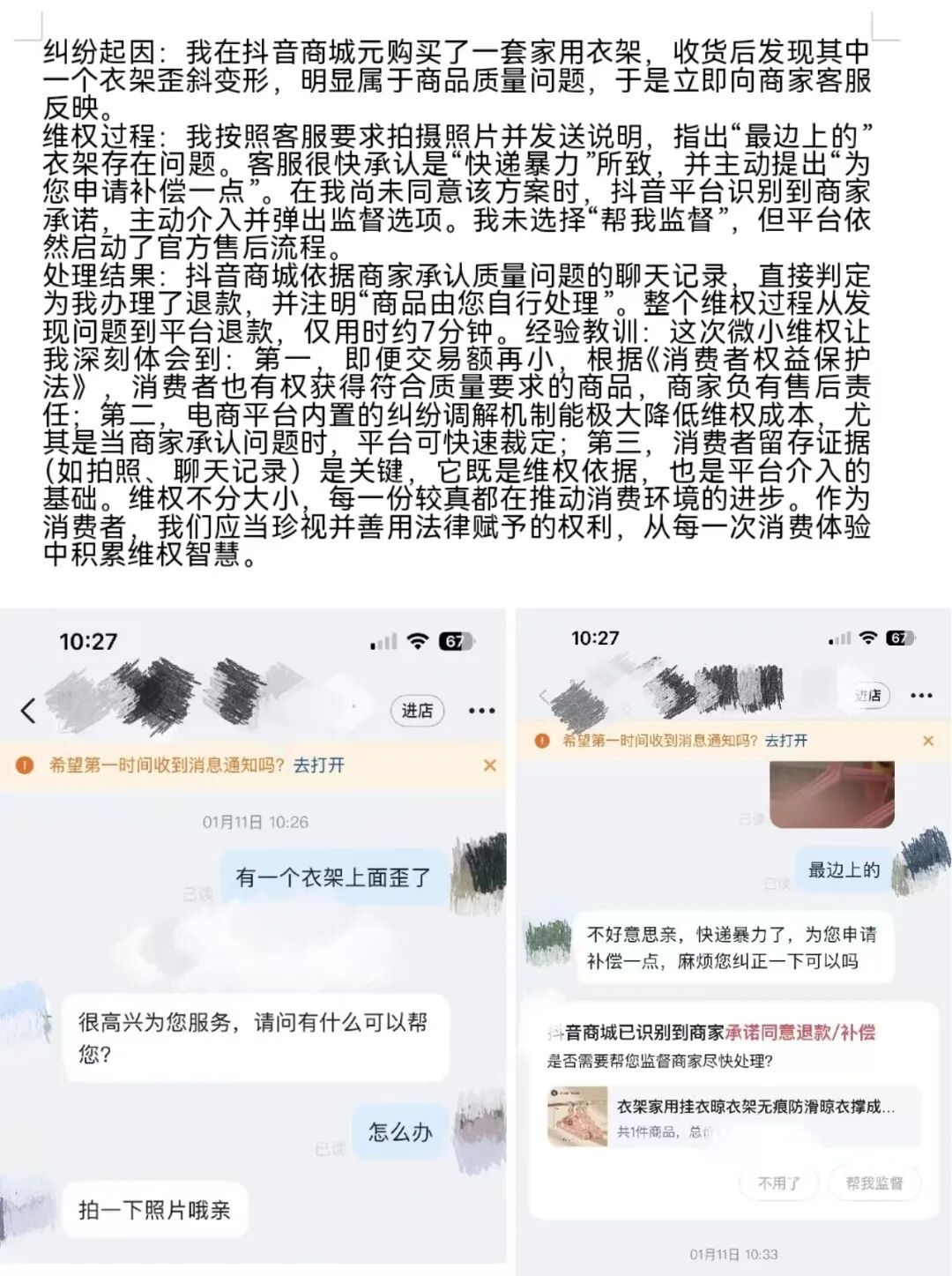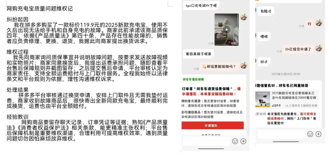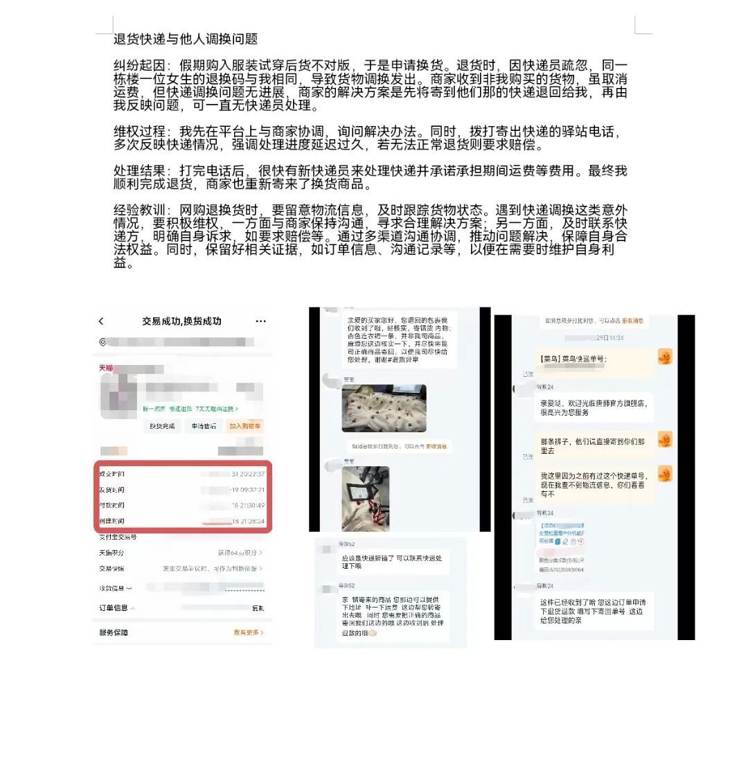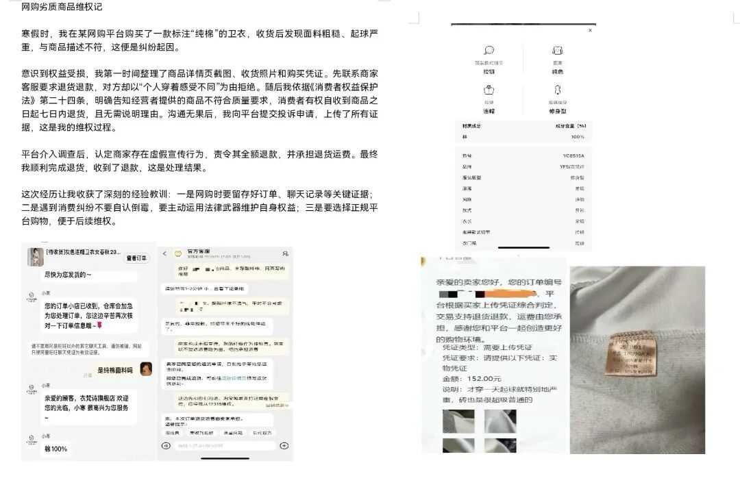 活动紧扣假期出行、兼职实习、消费购物、快递理赔等常见维权场景展开。同学们通过“纠纷起因—维权过程—处理结果—经验教训”这一清晰主线 ,以分享自身经验的形式普及维权知识。同学们通过讲述自己的维权故事,并加以附上维权聊天记录、转账凭证等截图,使故事更加真实可信、更具参考价值,让维权不再是冰冷的词条。在分享中,同学们既传递了实用的维权知识,也深化了对法治精神的理解,展现出同学们日益增强的维权意识与责任担当。这些鲜活的故事,为更多人提供了可参照、可学习的维权路径,真正实现了“在分享中学习,在交流中共进”的活动目标。