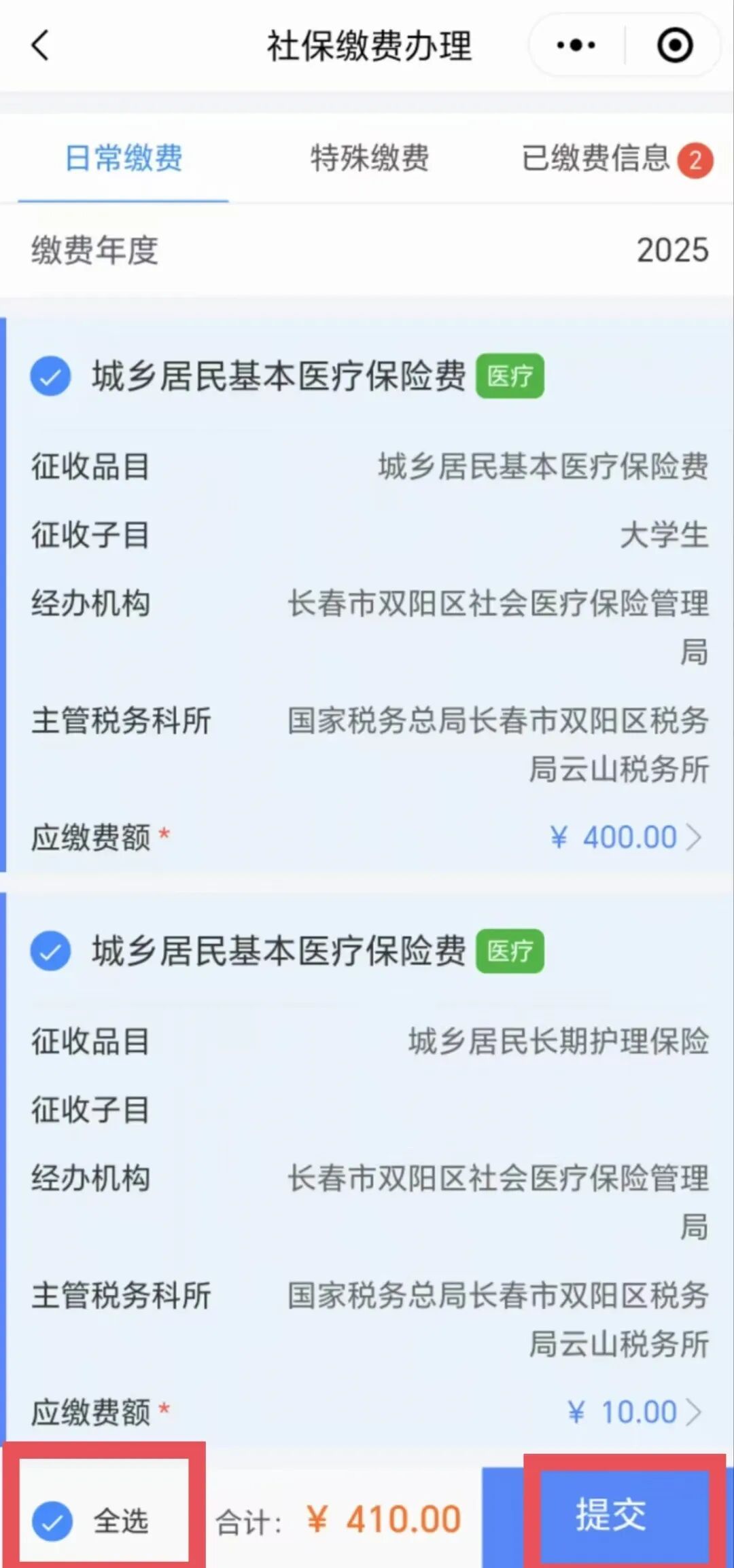 2025年度居民医保个人缴费标准为每人每年400元。城乡居民失能人员医疗照护保险个人缴费标准维持不变,仍为每人每年10元。居民照护险个人缴费部分与居民医保费同步征收,在缴纳居民医保费时一并缴纳,共计410元。