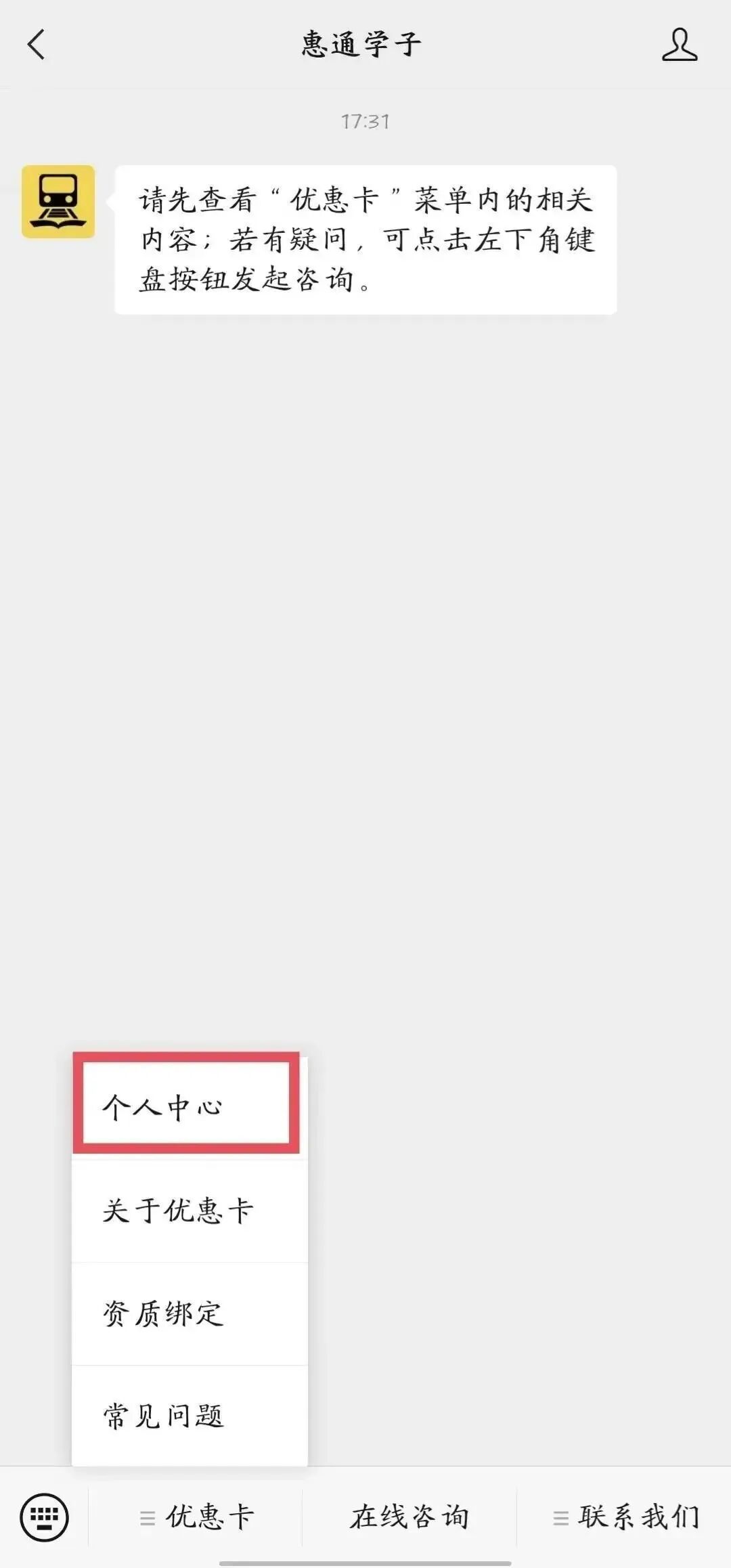 1扫描下方二维码关注微信公众号“惠通学子”,点击个人中心
