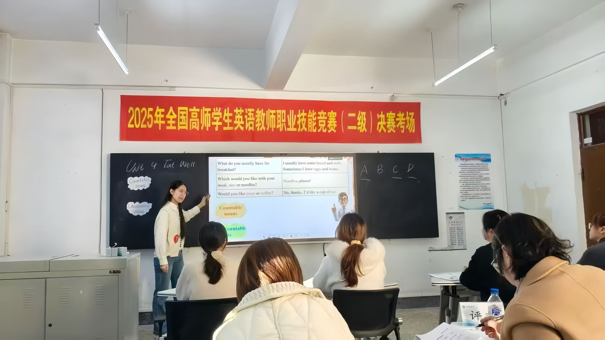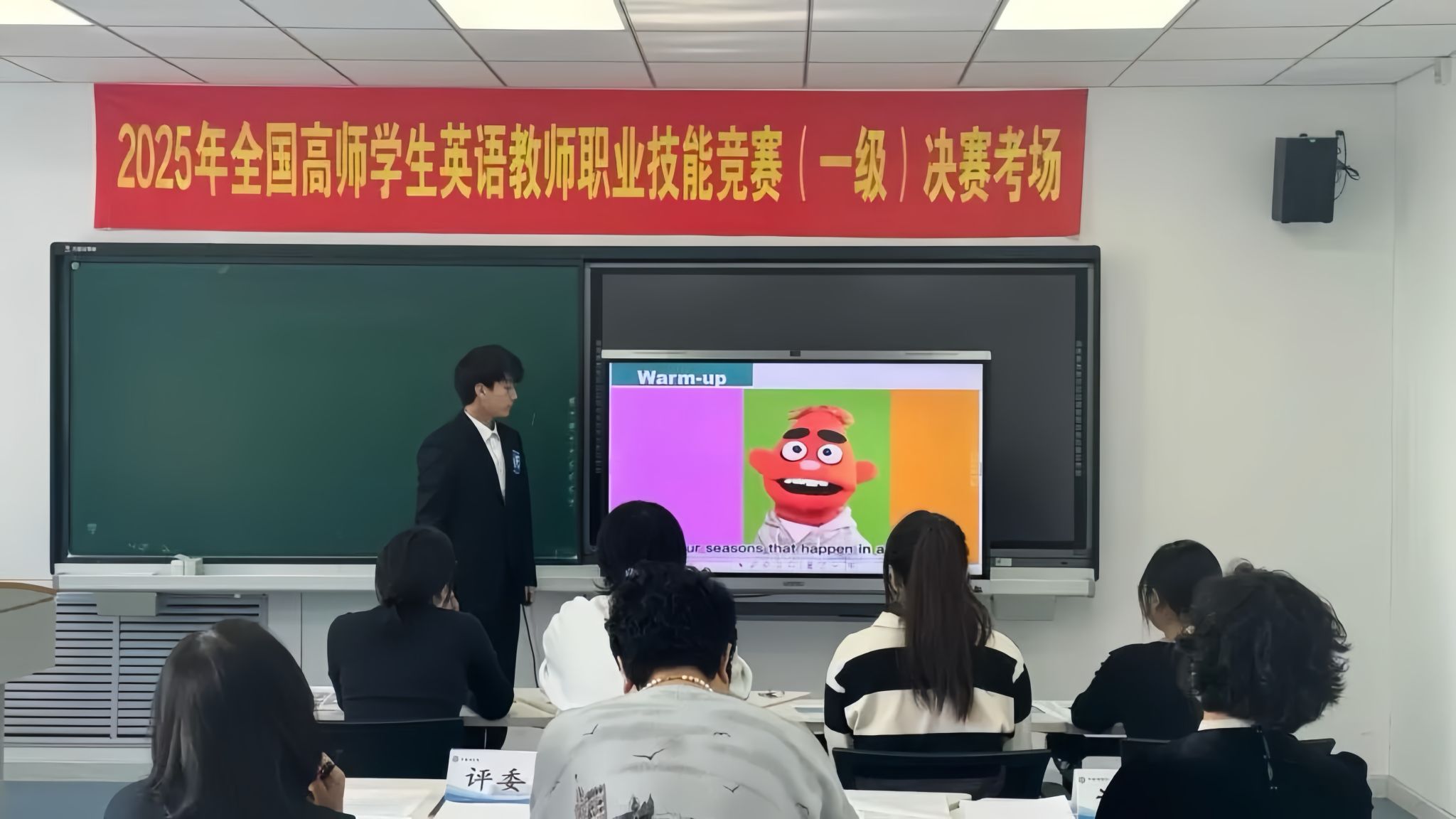 本届比赛要求选手在8分钟片段教学中,全英文展示某一教学环节或活动片段,并同步提交教学设计方案与教学视频。比赛中,我院两位选手沉着自信、表现出色,以流畅的英语口语清晰阐释教学内容,在课堂导入、互动提问与总结提升等环节各展所长,充分展现了扎实的专业功底与独特的教学风格。经过一天激烈角逐,武梓恒同学荣获一级一等奖,詹家妮同学荣获二级二等奖。