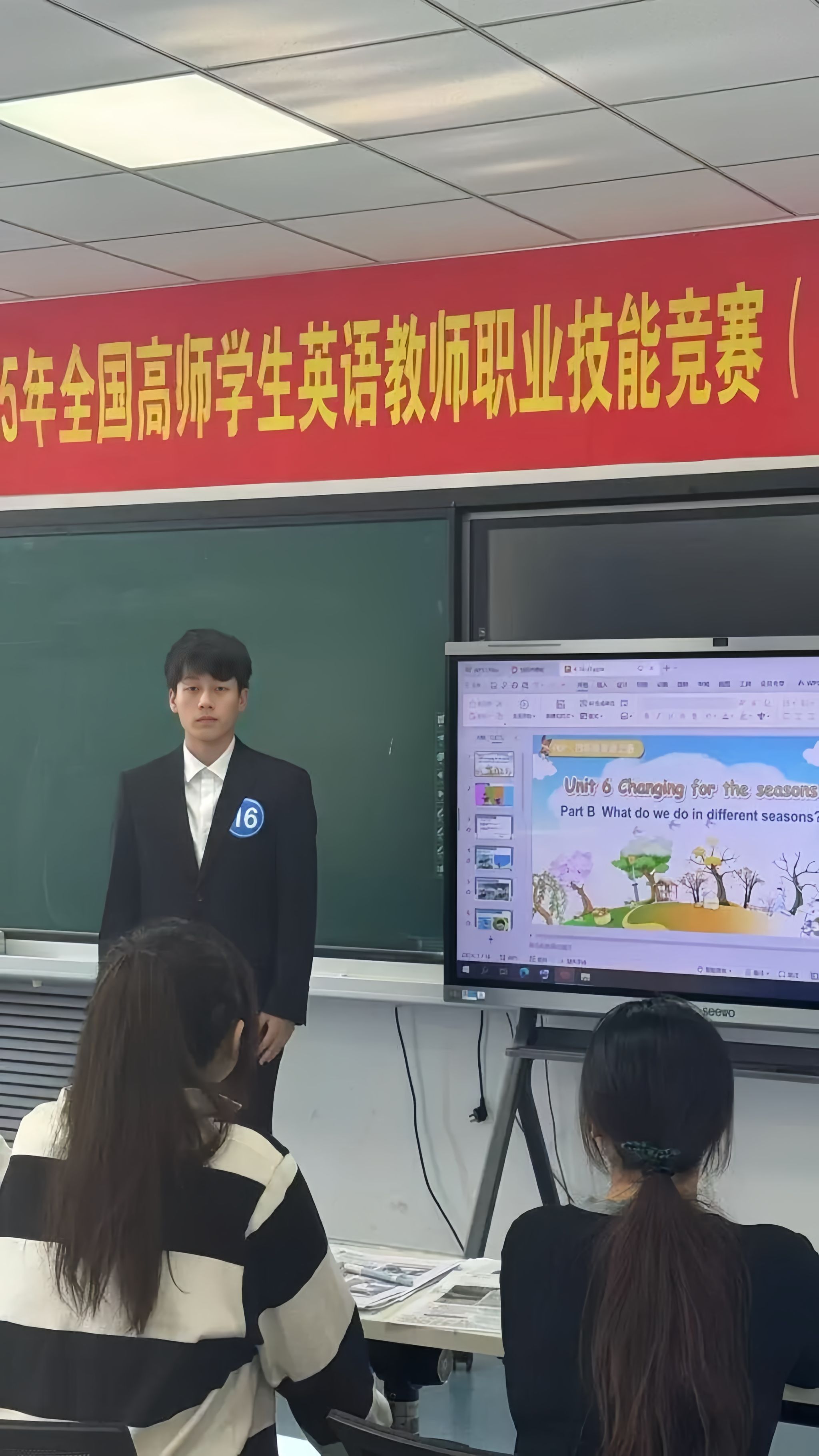 经过初赛选拔,教育与文化传播学院2023级英语1班詹家妮同学与2025级英语1班武梓恒同学脱颖而出,代表学校参赛。学院高度重视此次比赛,赛前专门组织教学设计专题培训,系统讲解教学目标设定、课堂活动组织与教学评价策略等核心内容,并组建指导教师团队,为每位选手提供“一对一”精准辅导。备赛期间,同学们潜心钻研,通过反复备课、磨课与模拟演练,不断优化教学设计与课堂表现,有效提升了教学把控与课堂呈现能力。