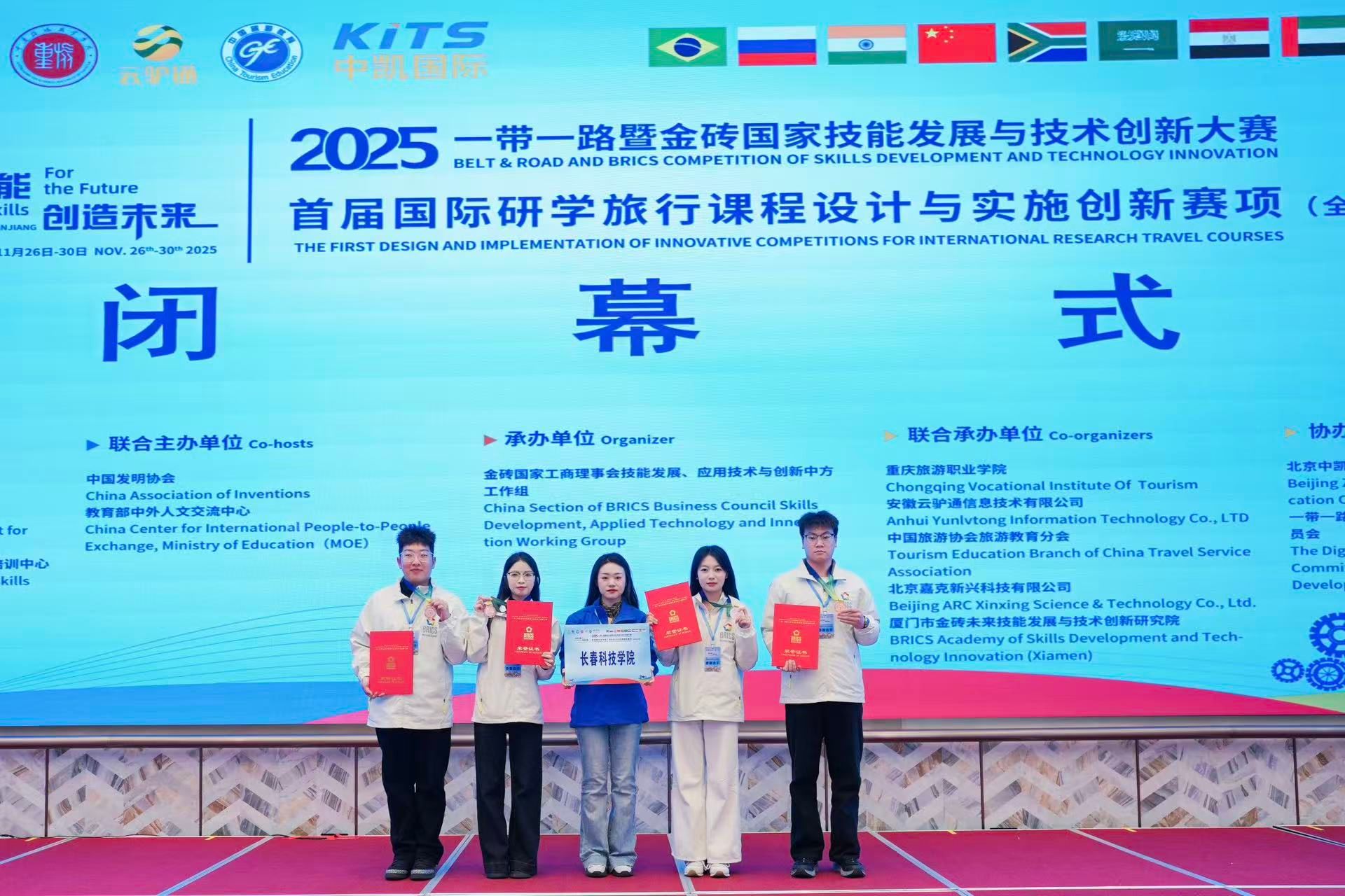 近日,2025年“一带一路暨金砖国家技能发展与技术创新大赛”首届国际研学旅行课程设计与实施创新赛项全国总决赛圆满落幕。由长春科技学院教育与文化传播学院杨晓月(22级小学教育专业)、陈永蹬(24级专升本小学教育专业)、左宝程(23级小学教育专业)、相煜晗(24级网络与新媒体专业)四位同学组成参赛团队,取材吉林省三角龙湾火山群和杨靖宇将军东北抗联事迹,以“青染火山、红映忠魂”为主题,在优势教育产业学院成员单位吉林龙湾群旅游有限责任公司鼎力支持下,在宋卓、别琳两位老师精心指导下,团队凭借扎实的理论知识、精准的产品主题定位、完整的课程体系与生动的实践展示,在全国总决赛中成功斩获本科组铜牌。