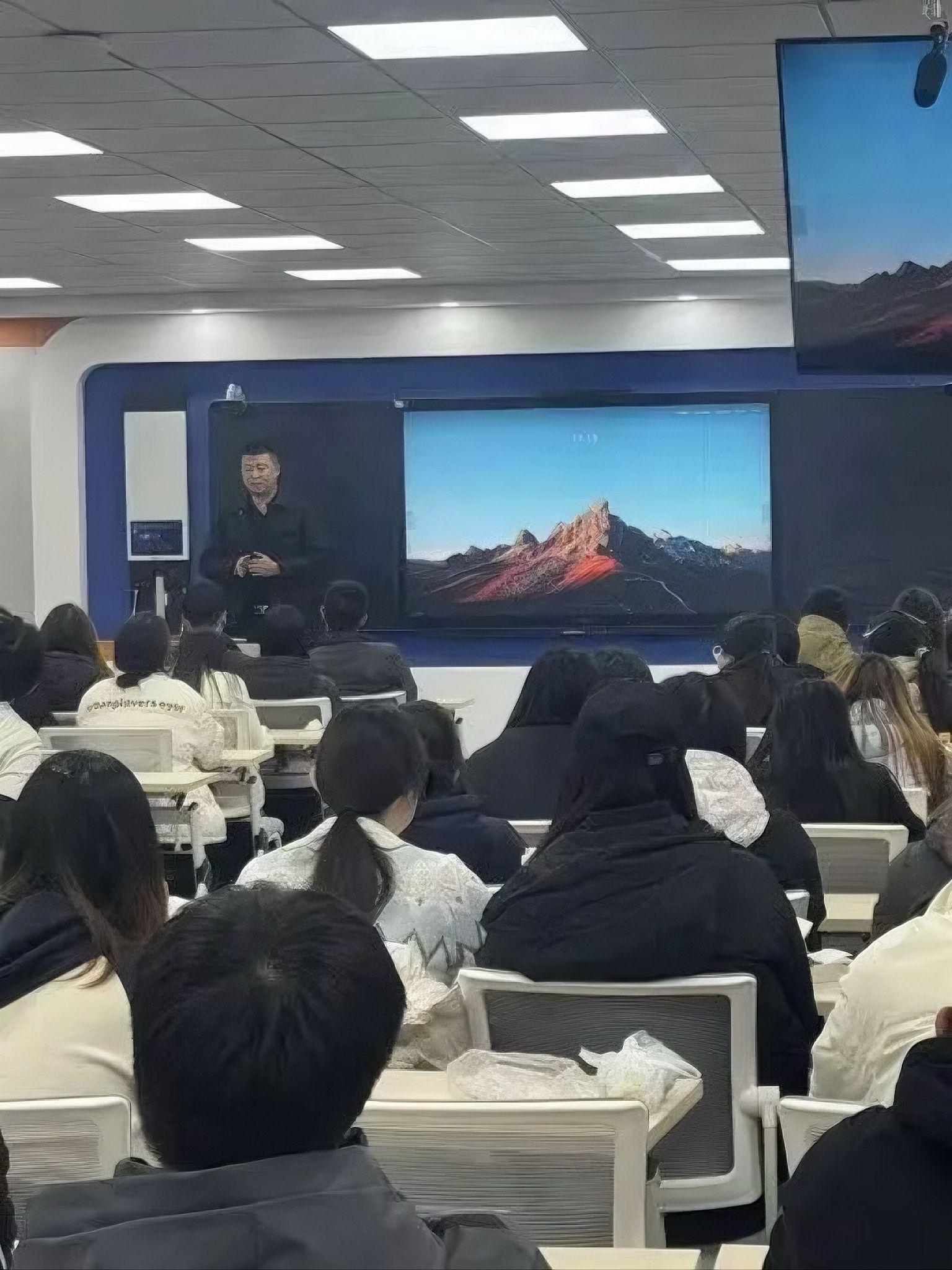 在具体实施过程中,学院与企业协同发力,构建了“案例讲解+趋势解读+实操分组”的立体化宣讲与实践体系。宣讲会上,新媒体实战专家吴金石老师以长春动植物公园“雪饼猴”IP打造、长影世纪城主题推广等本土现象级案例,拆解新媒体项目运作逻辑,让学生直观感受行业实战的核心要点;行业投资人邢栋老师则深入解读直播赛道发展趋势,拆解主播、运营、剪辑、文案四大岗位的能力需求,引导学生结合自身特长定位职业方向,并通过“坚持比天赋更重要”的职业理念分享,帮助学生树立正确的就业观。互动环节中,企业导师还针对学生提出的项目参与、技能提升等问题逐一解答,并根据学生兴趣与特长完成四大岗位初步分组,为后续实战项目储备了人才。