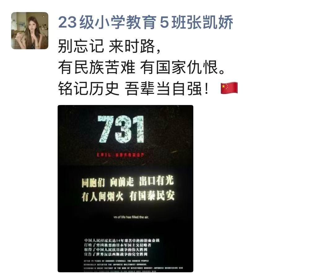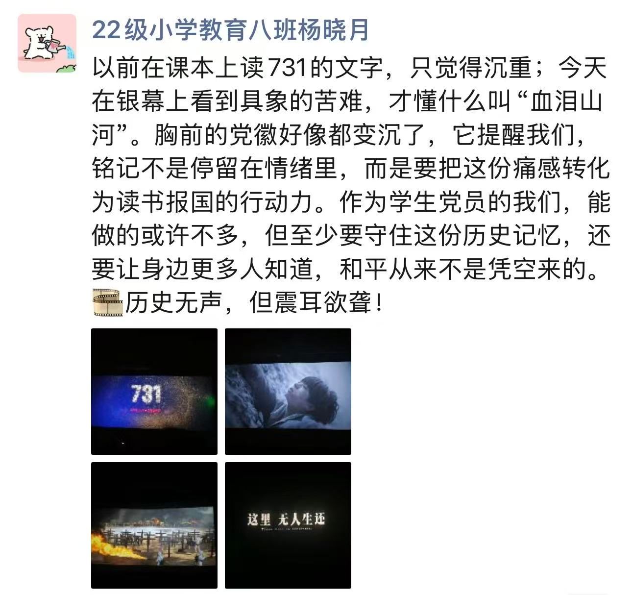 影片结束,灯光亮起,现场依然笼罩在肃穆凝重的氛围中。许多师生眼眶湿润,神情庄重,画面中的历史苦难久久萦绕心头。大家纷纷表示,教科书上“勿忘国耻”四字,背后是千千万万同胞的血泪与牺牲。作为新时代的青年党员与积极分子,必须坚决守护历史记忆,扛起强国复兴的使命。要将此次观影带来的震撼与思考,转化为砥砺前行、实干担当的强大动力,以实际行动践行初心使命。