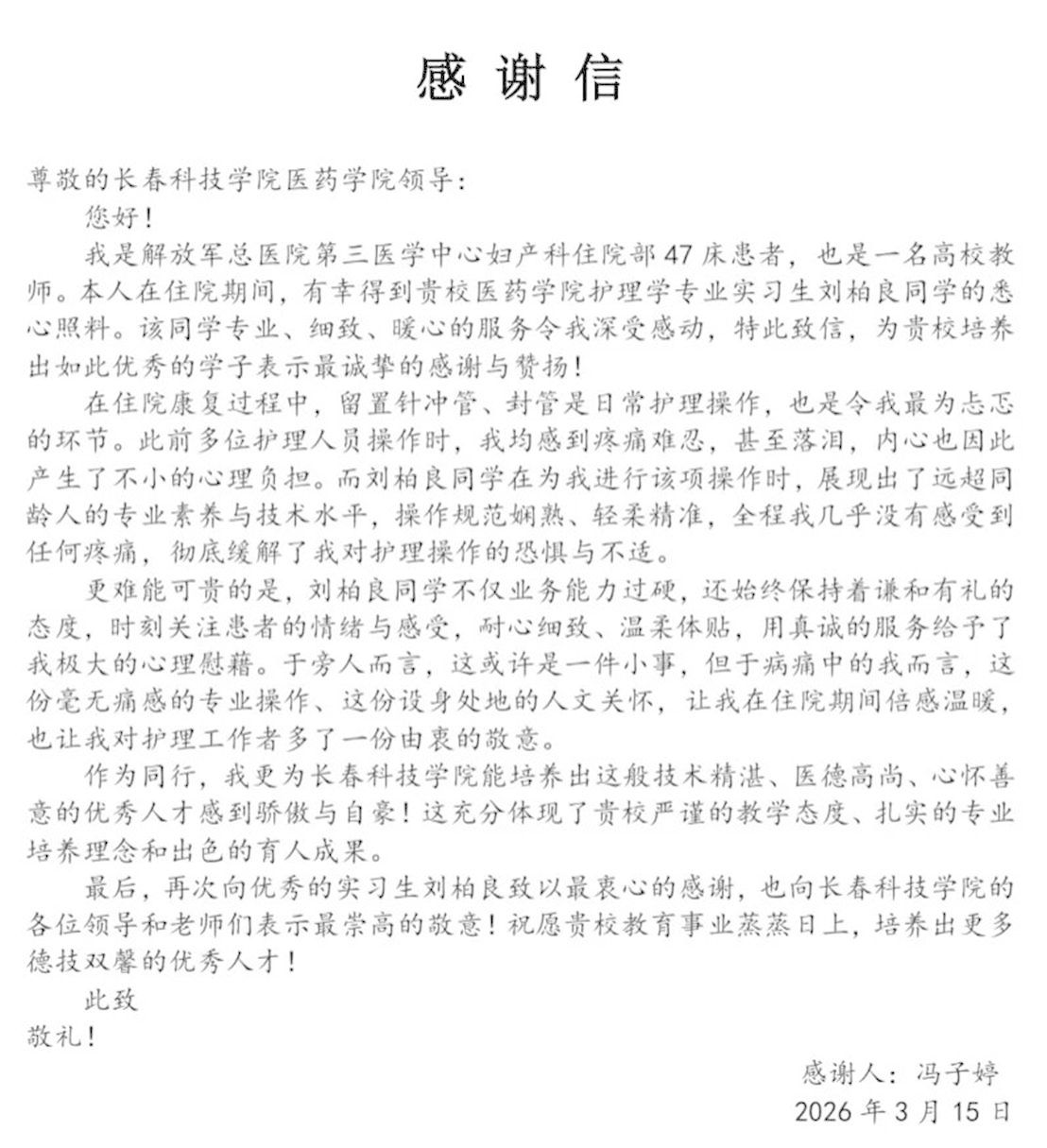 近日,我院收到一封来自中国人民解放军总医院第三医学中心妇产科住院患者冯子婷的感谢信,信中饱含深情地赞扬了我院护理学专业实习生刘柏良,对其精湛的专业技能与暖心的人文关怀给予高度肯定,也为学校培养出德技双馨的优秀学子点赞。