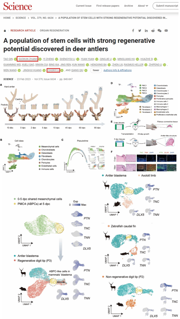 2023年研究团队联合西北工业大学邱强教授团队,在国际顶级学术期刊《Science》发表题为“A population of stem cells with strong regenerative potential discovered in deer antlers”的研究成果,实现了我校乃至双非院校CNS主刊文章零的突破。与苏州大学的时玉舫院士团队合作在自然出版集团的Cell Death and Differentiation杂志上发表了题为“Deer antlers: the fastest growing tissue with least cancer occurrence”的文章,实现了民办院校第一次以第一单位在中科院1区,影响因子13分的杂志上发表的文章的突破。