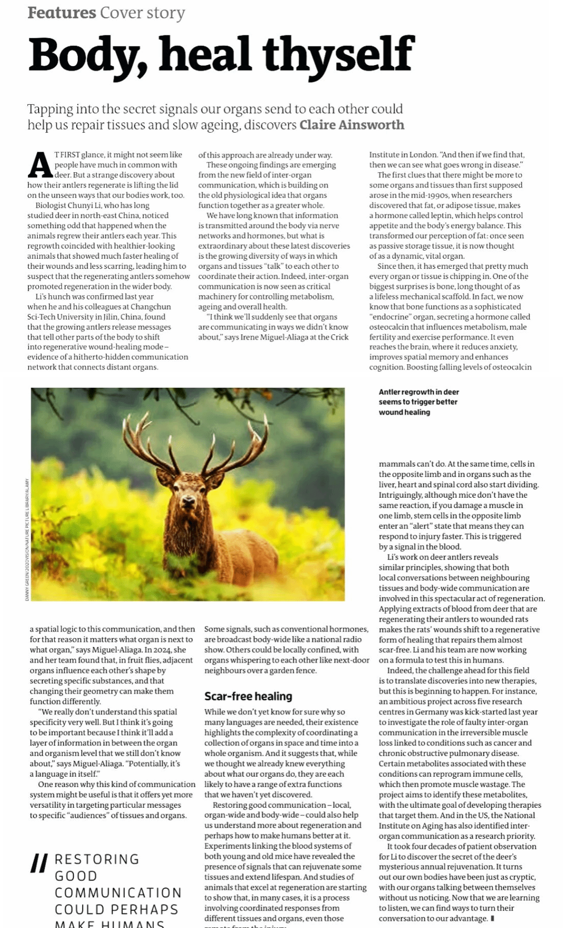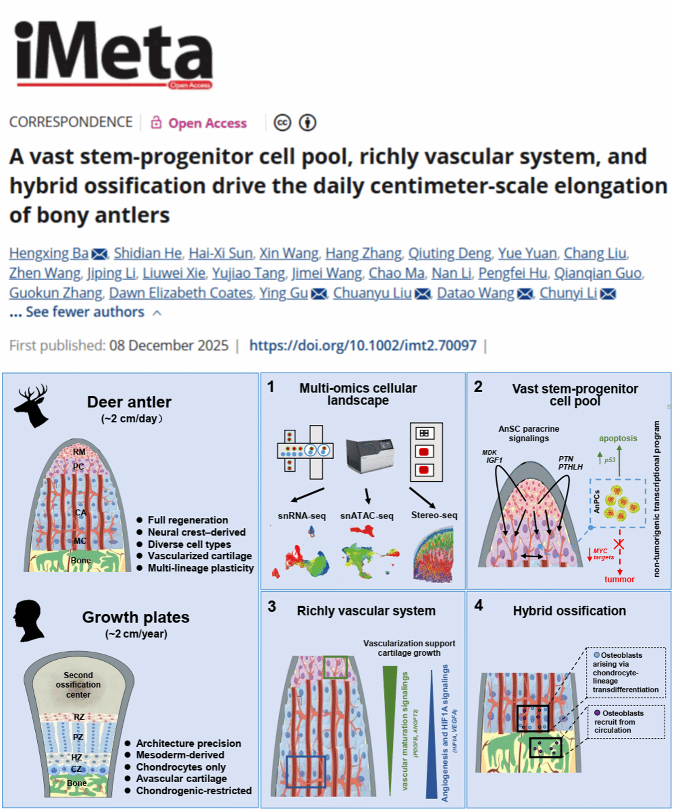 研究团队在鹿茸生物学研究方面取得了令人瞩目的成果,入选2023年度“中国农业科学十大进展”,被国际著名科普杂志《The Scientist》报道,2026年再次被国际顶级科普期刊《New Scientist》以器官间通信与机体再生为核心主题,刊发长篇深度报道。近五年,承担中科院A类先导专项、国自然重点、面上、青年项目等国家级课题7项,吉林省自然科学基金重点项目、吉林省自然科学基金-联合基金项目,吉林省发改委建设项目等省市级课题20余项,在Science、iMeta、PNAS等杂志上发表高水平SCI收录论文100余篇,授权发明专利10余项,完成了鹿茸干细胞分泌物原料的新品种研发与转化,获吉林省自然科学二等奖。