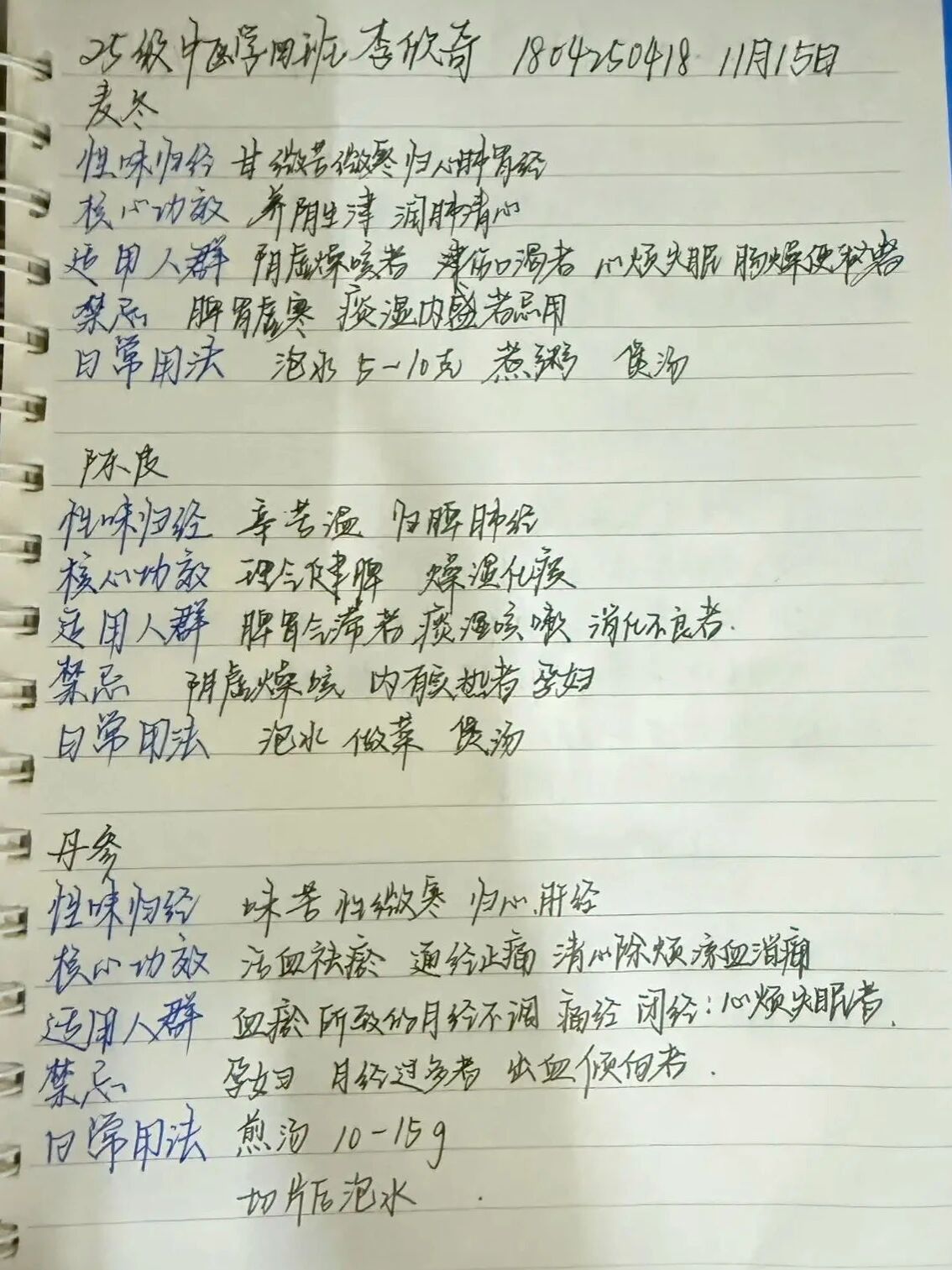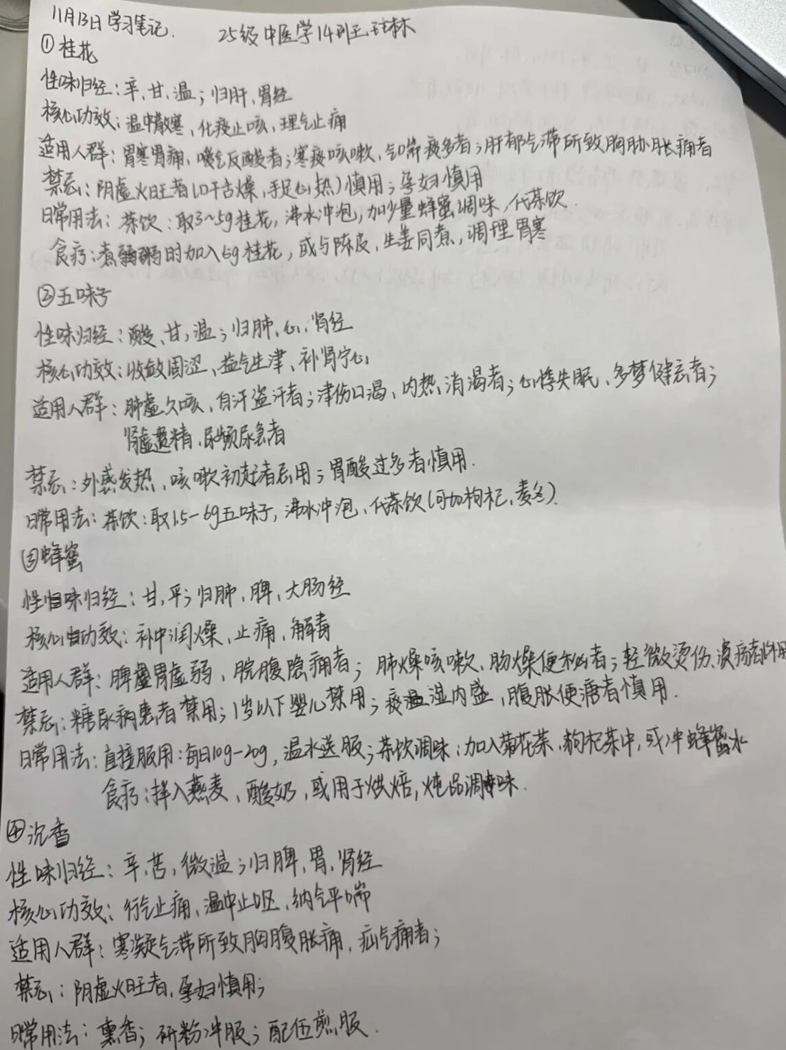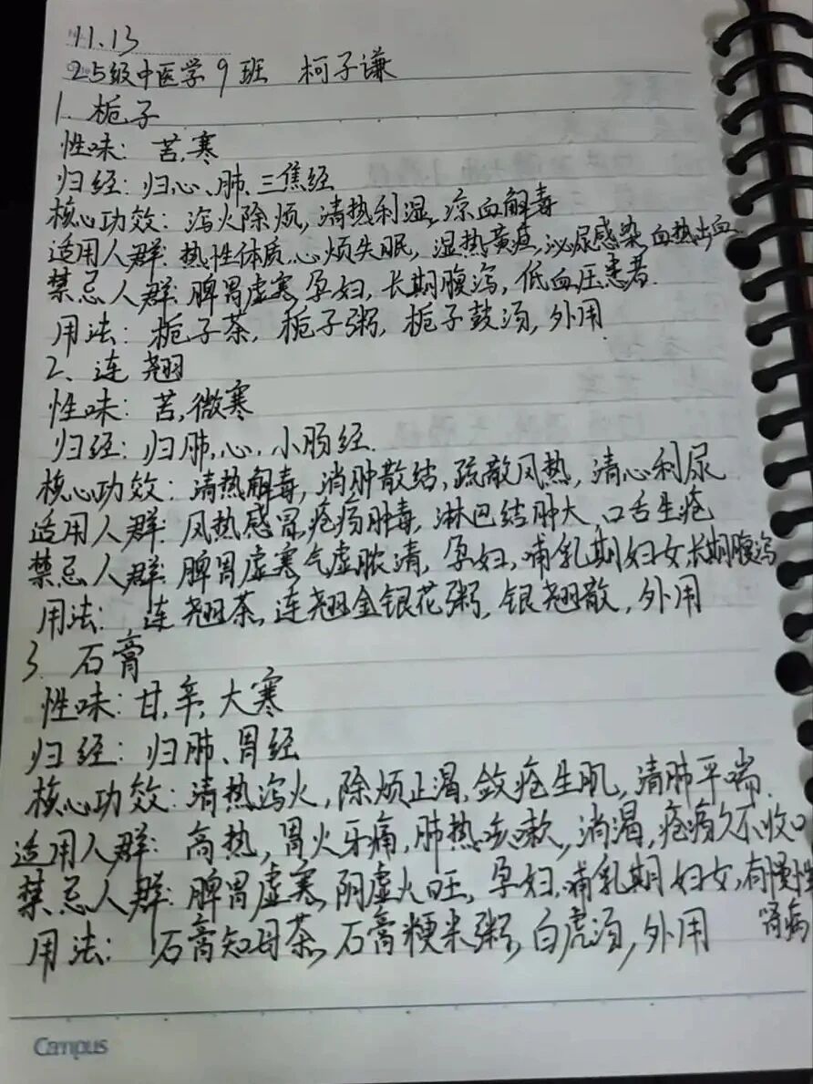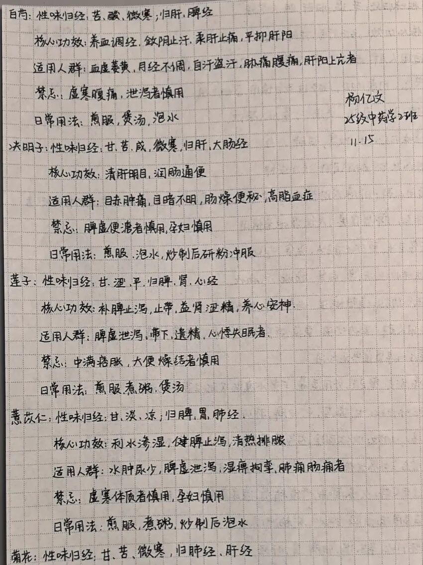 活动以“碎片化学习+打卡积累”为核心模式,为同学们搭建了轻量化、系统化的中药学习平台。参与同学每日深耕一味中药,手写记录药材的性味归经、核心功效、适用人群、禁忌及日常用法,以清晰的笔记、规整的排版展现学习成果,并按时在活动群完成打卡。7天里,大家主动查阅书籍、搜集线上资料,在自主探索中积累知识;工作人员严格核查打卡内容,杜绝抄袭与虚假打卡,保障了活动的公平公正。一张张详实的手写笔记、一次次准时的打卡提交,不仅见证了同学们的坚持与成长,更营造了“每日学一点,积累成体系”的浓厚学习氛围。