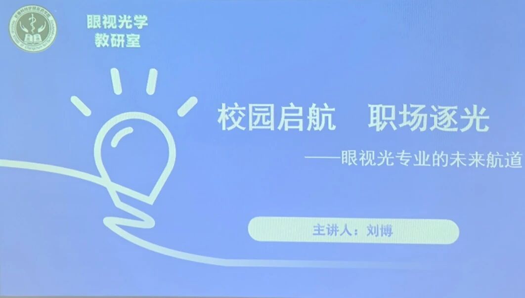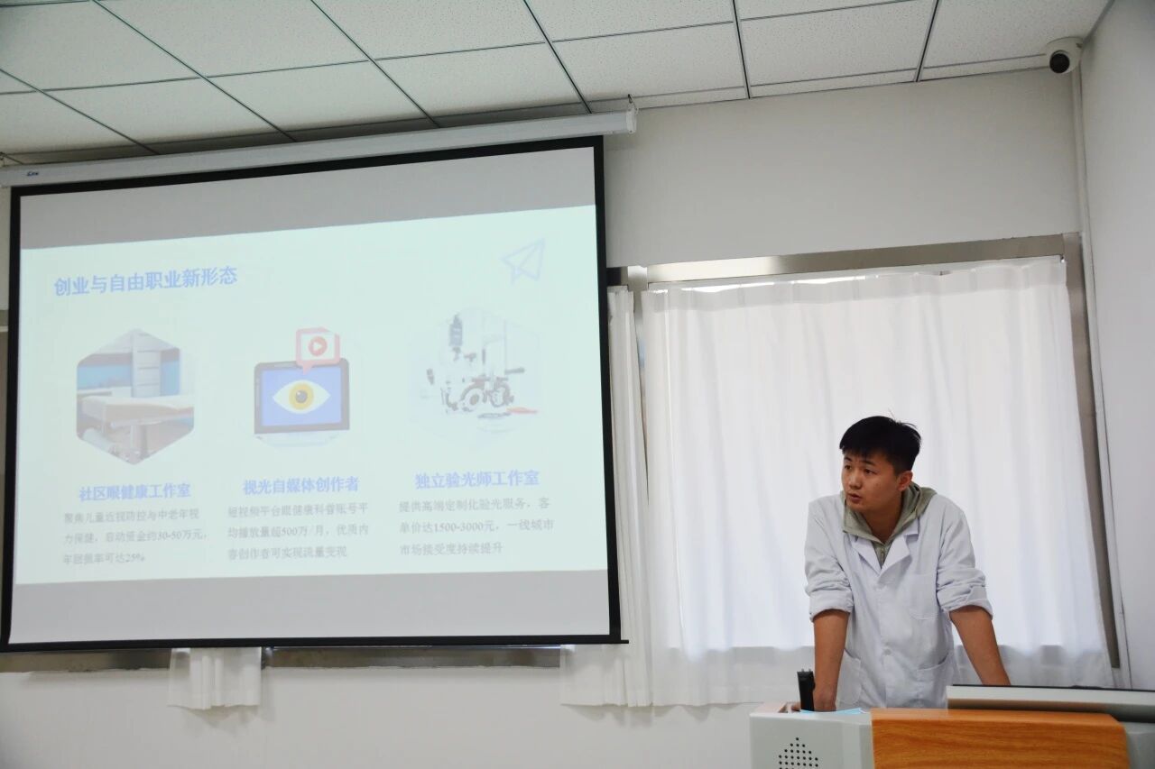 为助力学生明晰眼视光行业前景、找准职业发展方向,我院眼视光学教研室于2025年11月18日在眼视光实训室210,特邀刘博老师以“校园启航,职场逐光”为主题开展专题讲座。