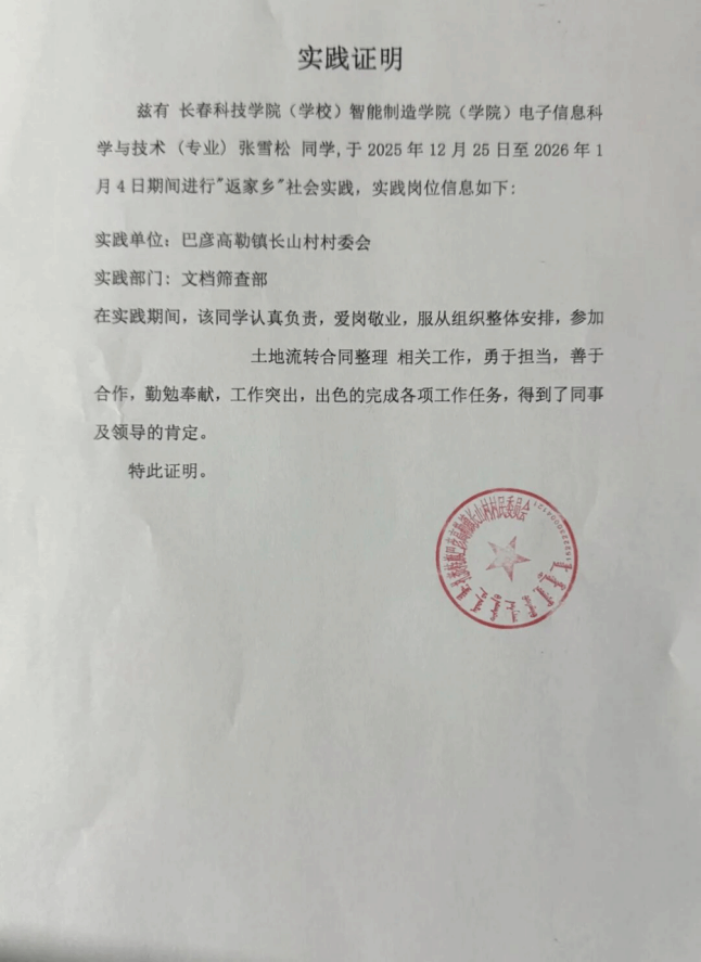 这个寒假,我以返乡社会实践者的身份,走进巴彦高勒镇长山村村委会文档筛查部,从2025年12月25日到2026年1月4日,短短十天的基层实践,让我这个电子信息科学与技术专业的学生,彻底走出了校园里的理论课堂,在乡村治理的一线,触摸到了基层工作的肌理与温度,也完成了一次从“纸上谈兵”到“躬身实践”的深刻蜕变。