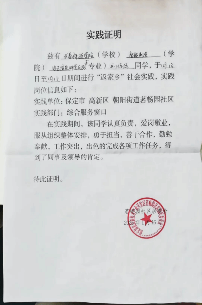 实践虽已结束,但成长从未落幕。未来我会将实践收获转化为动力,以踏实务实的态度、真诚奉献的初心提升自我,努力成为有温度、有担当、能实干的新时代青年,用青春力量为社会发展添砖加瓦。