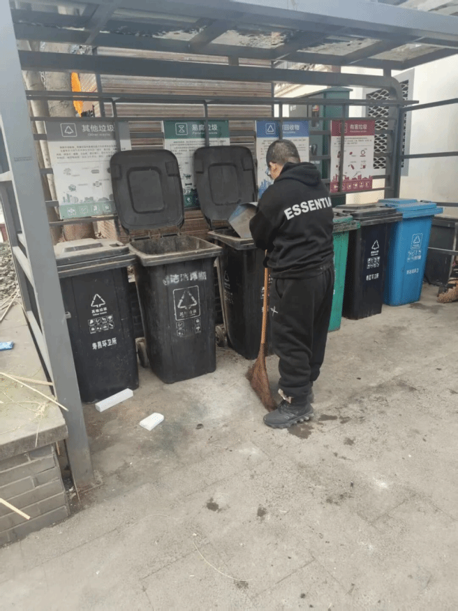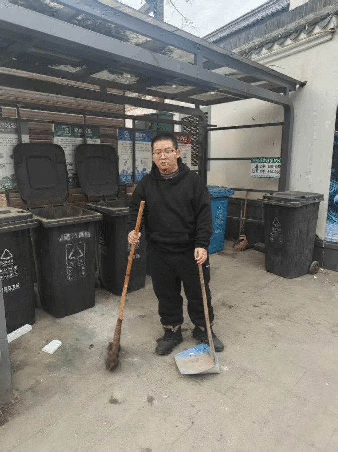 这一次我返家乡参与的志愿者服务是帮助社区清洁小区卫生,主要是对小区的弄堂口和街道广场以及倒垃圾处进行清理。起初我以为这只是简单的体力劳动,真正动手才发现,每一处都藏着不易。弄堂口狭窄逼仄,陈年油污和顽固污渍黏在地面,普通扫帚根本扫不干净,只能蹲下身用钢丝球一点点擦拭;街道广场上,落叶与烟头、塑料袋混杂,被风卷到角落和缝隙里,弯腰捡拾久了,腰腹阵阵发酸;最棘手的是垃圾投放点,异味刺鼻不说,散落的厨余垃圾和废弃包装缠在一起,清理时既要小心不弄脏衣物,又要确保分类归置,稍不留意就会遗漏。