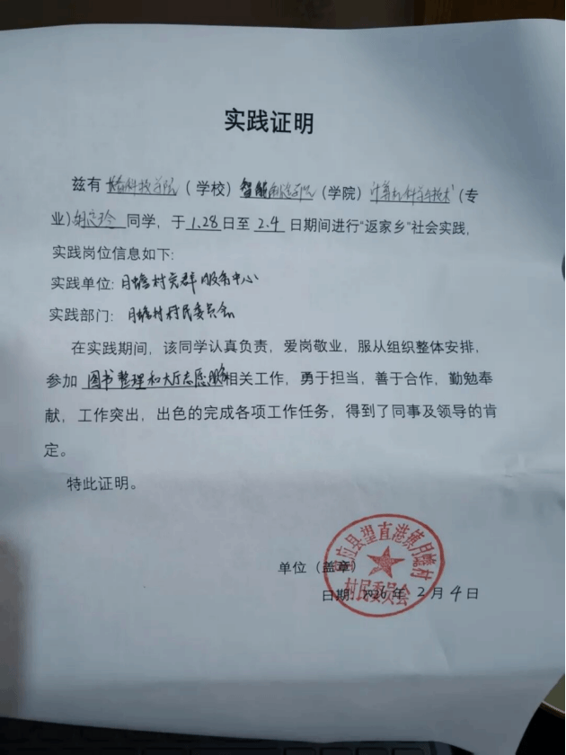 七天的时光转瞬即逝,但收获却是沉甸甸的。这份实践证明,不仅是对我工作表现的肯定,更是我深入社会、了解国情、增长才干的珍贵见证。它让我更加明确了作为新时代青年的责任与担当——不能只做家乡发展的见证者,更应努力成为建设的参与者。我将把这次实践中汲取的养分转化为未来学习和奋斗的动力,夯实专业基础,提升综合素养,永葆服务社会的初心。我深信,只有将个人成长的根系深植于国家和人民需要的沃土之中,青春之花才能绽放得更加绚烂。