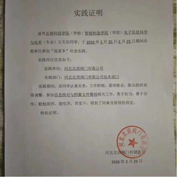 六天的实践转瞬即逝,却让我收获颇丰。专业上,我了解了阀门行业的技术标准与文件管理规范,掌握了信息核对的科学方法,将课堂所学的工程管理知识与企业实际工作相结合;能力上,我的细心程度与逻辑思维得到了锻炼,学会了在繁杂的文件中梳理脉络、高效完成任务;思想上,我对 “知行合一” 有了更深的理解 —— 技术工作不仅需要扎实的理论功底,更需要严谨的工作态度和务实的工作作风。同时,通过近距离观察河北北消阀门的发展,我看到了家乡企业在技术创新与标准化建设上的努力,这让我对家乡的产业发展充满信心,也萌生了未来反哺家乡、助力企业发展的念头。