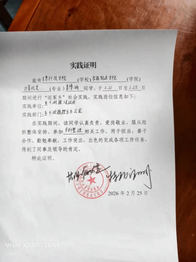 在2026年2月21日至2月25日期间,我作为长春科技学院智能制造学院计算机类专业的学生,回到家乡查干湖镇人民政府综合办公室,参与了“返家乡”社会实践活动。短短五天的实践时光,让我从校园的理论学习走向基层的实干岗位,不仅对家乡的发展有了更真切的认知,更在实践中锤炼了本领、收获了成长。