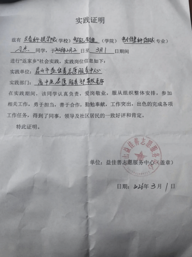 此次寒假志愿服务,让我走出校园,深入社区,真切感受到基层服务的意义。它不仅丰富了我的寒假生活,更让我明白,志愿服务不是一句口号,而是脚踏实地的行动。在未来的日子里,我将继续投身志愿事业,也会带动更多同学参与其中,用青春力量传递温暖,用实际行动践行青年担当,让志愿之花在昆山大地绽放更多光彩。