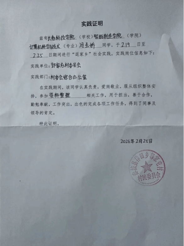 情暖寒岁添暖意,青春践行显担当!为扎根基层沃土,书写青春华章,智能制造学院积极响应号召,组织学子参与2026年寒假“返家乡”社会实践活动,躬身实践、传递温情、不负韶华。