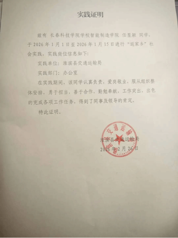 2026年1月1日至1月15日,我作为长春科技学院智能制造学院学生,回到家乡淮滨县,在淮滨县交通运输局办公室完成了为期半个月的“返家乡”社会实践。这段经历让我跳出校园课堂,在基层政务工作中收获了成长与感悟,更深刻体会到青年服务家乡的责任与价值。