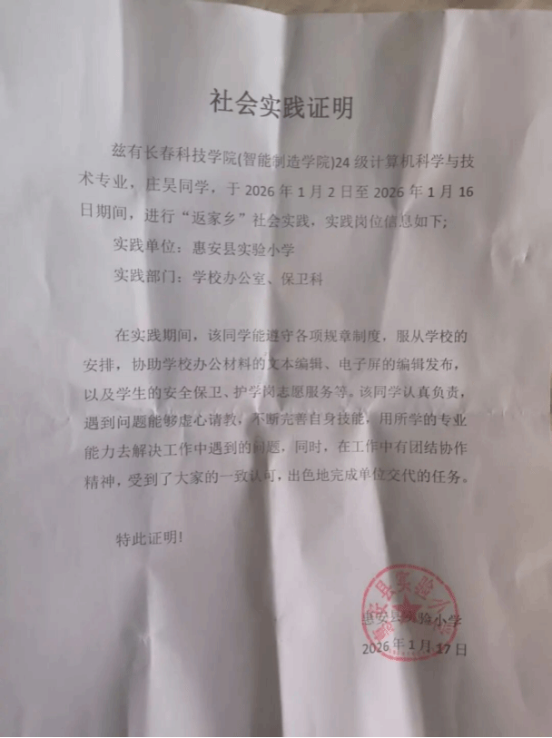 在2026年1月2日至1月16日这段时间里,我作为长春科技学院智能制造学院24级计算机科学与技术专业的学生,回到家乡惠安县,在惠安县实验小学的办公室与保卫科开展了为期两周的“返家乡”社会实践。这段经历中,我以护学岗志愿服务为核心,辅以少量办公事务,不仅走出了课堂的理论框架,更在守护学生安全的一线岗位上,真切体会到了责任与担当的重量,也让我对家乡的教育事业有了更深的情感联结。