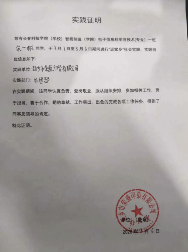 在新乡市荣盛印染有限公司外贸部为期六天的 “返家乡” 社会实践活动,是我从校园走向社会的一次宝贵历练。这段时光里,我不仅将专业知识与实际工作相结合,更在实践中深刻体会到责任与担当的重量,收获了成长与蜕变。