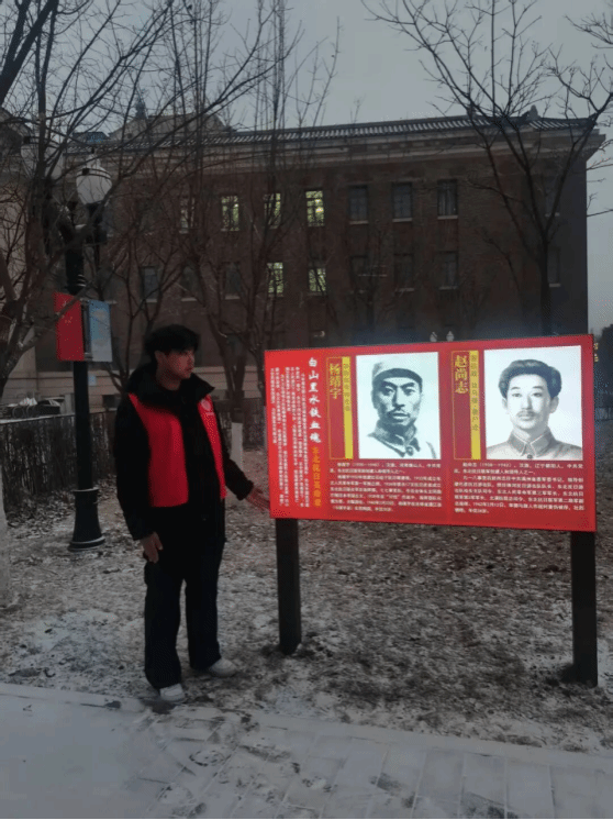 更让我受益匪浅的是社区红色教育岗的站岗讲解工作。作为家乡的红色文化宣传员,我负责向前来参观的居民讲述杨靖宇将军的英雄事迹。为了做好讲解,我查阅了大量史料,从将军青年时期投身革命,到九一八事变后在白山黑水间点燃抗日烽火;从率部在零下四十度的严寒中与敌周旋,到最后壮烈殉国时胃里仅有草根、树皮与棉絮,每一个细节都让我深受震撼。当我向孩子们讲述 “头颅不惜抛掉,鲜血可以喷洒,而忠贞不贰的意志是不可动摇的” 这句誓言时,看到他们眼中闪烁的崇敬之光,我忽然明白,传承红色基因不仅是讲述故事,更是传递信仰的力量。有位老人听完讲解后,给我讲述了家乡与抗联相关的往事,让我意识到英雄从未远去,他们的精神早已融入家乡的血脉。