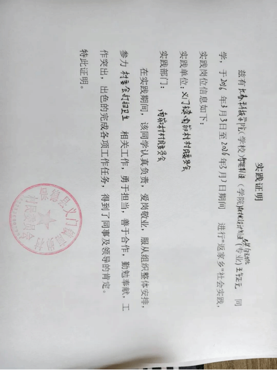 这段经历让我走出校园的象牙塔,真切感受到基层工作的辛苦与温暖。我学会了耐心沟通、认真负责,也懂得了奉献与担当的重量。作为新时代大学生,我们不应只专注于书本知识,更要深入社会、服务他人,将青春力量投入到家乡发展中。