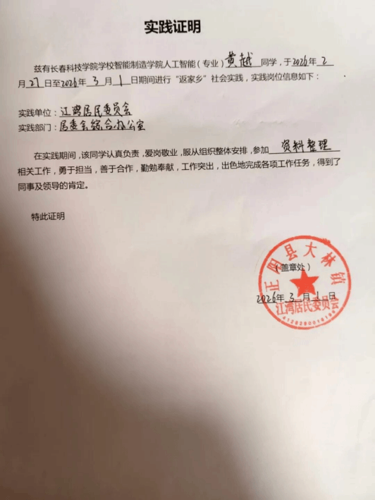 在2026年2月27日至3月1日期间,我作为长春科技学院智能制造学院人工智能专业的学生,去往正阳县大林镇江湾居民委员会,在居委会综合办公室参与了“返家乡”社会实践,主要负责资料整理相关工作。这段短暂却充实的经历,让我走出了校园的象牙塔,真切地走进了基层社区,收获了成长与感悟。