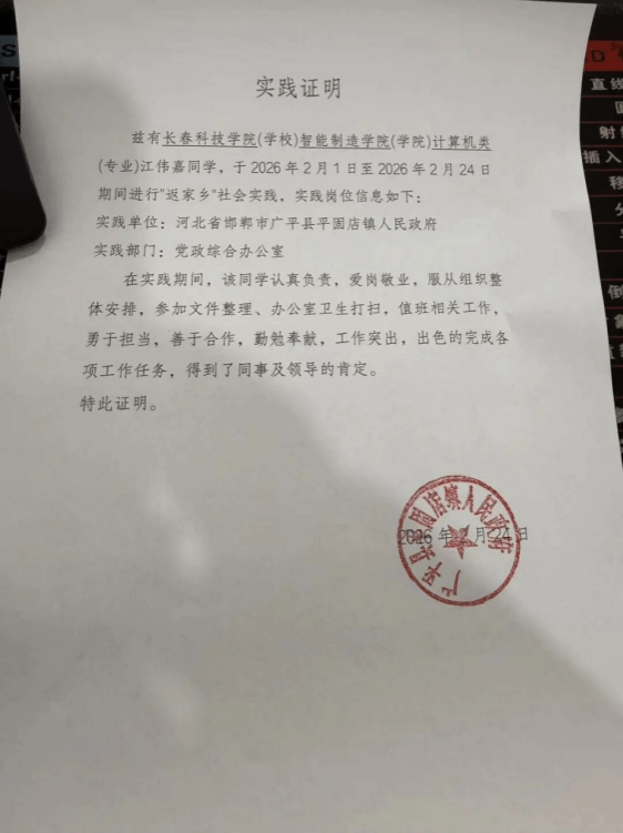 实践虽短,意义深远。作为长春科技学院的一名学生,这段经历让我更加明白,严谨的作风、奉献的精神,是未来职业道路上不可或缺的品质。我将把此次实践的收获带回校园,融入专业学习中,努力提升自我。未来,我会继续心怀家乡,积极参与基层服务,用青春的汗水践行青年担当,为平固店镇的发展贡献自己的一份力量。
