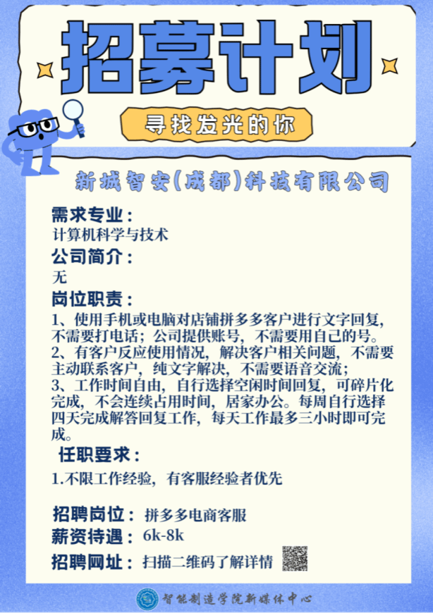 本公众号致力于提供专业的招聘信息汇总及转发服务,仅负责信息汇总与推送。如有侵权,请及时与我们联系以便删除。在求职过程中,同学们务必保持警惕。祝愿大家都能找到心仪的工作,开启精彩的职业生涯!后续学院还会持续为大家推送更多优质就业信息,请保持关注。